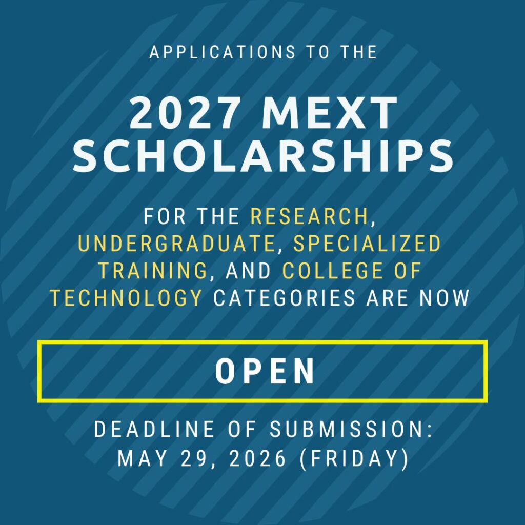 The Japan Information and Culture Center (JICC) of the Embassy of Japan in the Philippines is now accepting applications for four categories under the Japanese Government (MEXT) Scholarship Program: Research, Undergraduate, Specialized Training, and College of Technology. This will be for the 2027 intake of the program.